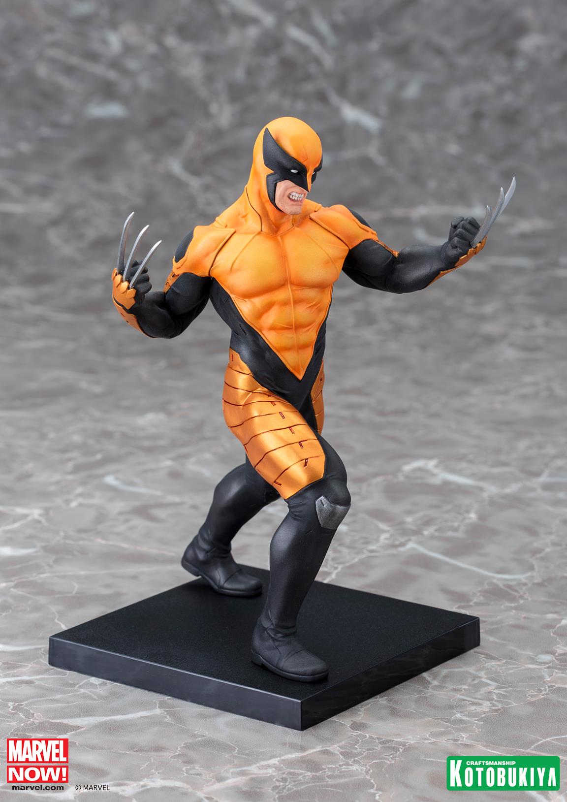 A nearly immortal mutant with a powerful healing factor and heightened senses, Wolverine was further enhanced by an adamantium-laced skeleton and ultra-sharp claws. Throughout his years with the X-Men (and other teams) he's worn several different costumes, and this new version is the ARTFX+ debut of his unique Marvel Now outfit consisting of a tough, combat-ready uniform. It's a full bodysuit revealing only the lower part of his face, though of course his claws protrude through it as well. Wolverine is captured in mid-lunge, stepping forward with his right leg as he jabs his left hand for a lethal strike. The stark black and yellow armor sections of his costume make a cool "X" out of negative space, and it includes his trademark pointed cowl. Logan's face is contorted into a fierce snarl as he attacks his enemies, and he looks super cool with his eyes covered by the pure white lenses of his costume.