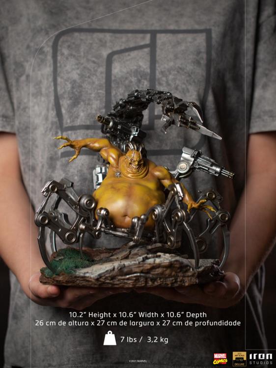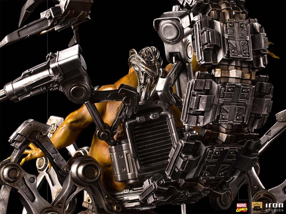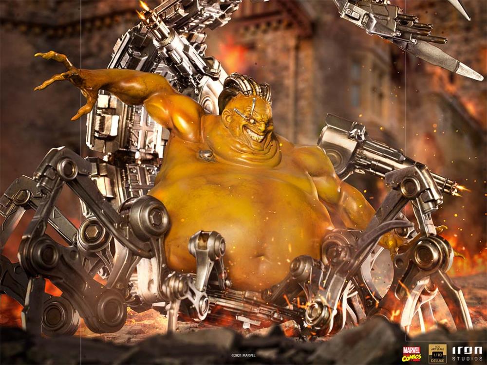 As if he's come straight out of a nightmare, a burly, misshapen, yellow-skinned being moves like an arachnid. Moved by mechanical paws that come out of a motorized platform to transport his obese body, and supported by a metallic tail, in place of his spine, just like a scorpion, as the tip of his tail releases deadly resources, with claws and particle beam weapons. A fearsome interdimensional sorcerer, master of manipulation and machinist of his universe, he advances, atop a base that resembles the gardens of Mansion X, along with other mutant super-villains, in a diorama setting, alongside Magneto and Robots Sentinels versus the X-Men. For fans and collectors, from the dimension that adds his name, Iron Studios proudly presents its statue "Mojo Deluxe 1:10 Scale Statue - Art Scale BDS Series."