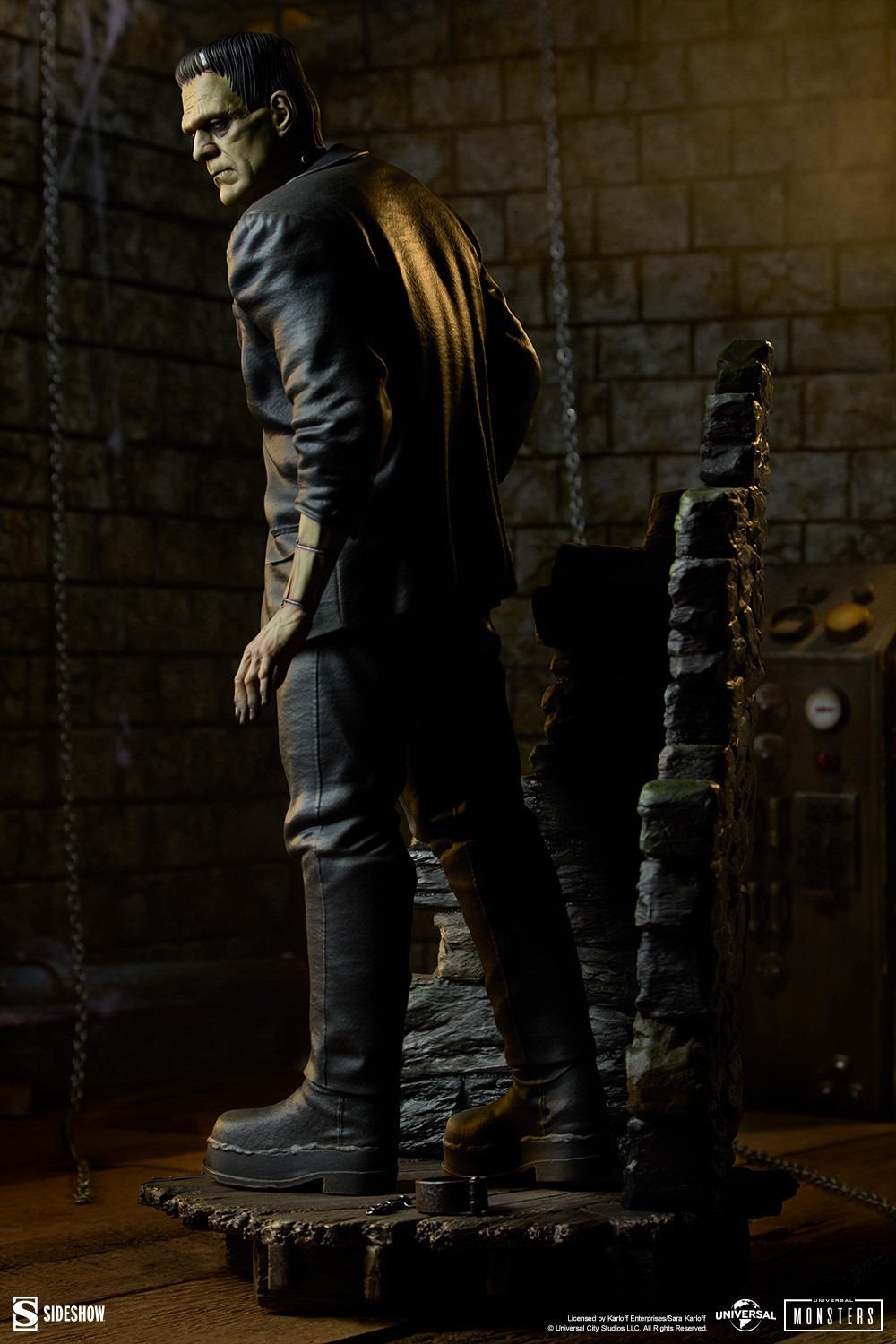 Returning to our horror roots with the character that shocked our company to life, Sideshow is proud to offer collectors a stunning new quarter-scale rendition of Frankenstein’s monster with a polystone body and costume sculpt that captures his intimidating, lumbering silhouette. He stands framed by the walls of his master’s castle, the environment sculpture recreating the uneven stone walls and dilapidated wood floors of the mad doctor’s domain. This high-end Universal Monsters statue also includes a pair of shackles as accessories that can either be placed along the base or attached to the figure’s wrists for added presentation options.