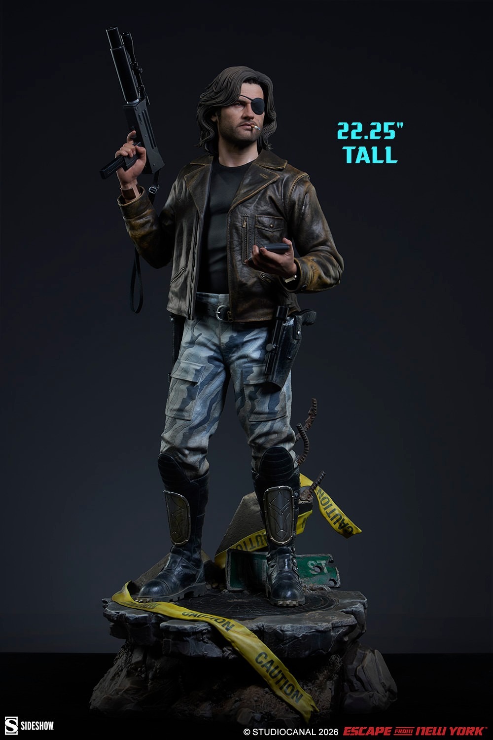 The Snake Plissken Premium Format Figure is sculpted wearing a detailed recreation of his rugged '80s style, including his jacket, black undershirt, gray and white camo pants, and spike-toed boots. Of course, Snake didn’t go in unprepared — the statue also features his belt and gun holsters, a tracker in his left hand, a submachine gun with silencer and scope (soft fabric strap included) in his right hand, and the Life Clock countdown timer on his wrist to ensure he stays on task. A detailed portrait completes his iconic silhouette with an eyepatch, cigarette, facial hair, and styled mullet, all ready for action.